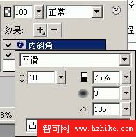 “內斜角”設置參數:斜角邊緣形狀為“平滑”、對比度為75%、柔化為3、角度為135、距離為10,按鈕預設為“凸起”。