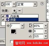 “投影”設置參數:距離為7、透明度為65%、柔化為4、角度為315。