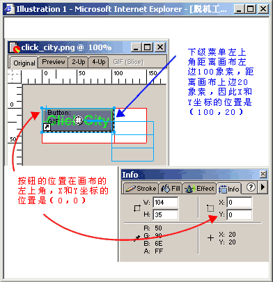 接著這名開發者把生成的Fireworks HTML代碼插入到Dreamweaver中(Insert->Interactive Images->Fireworks Html),然而按鈕在Dreamweaver頁面中的位置並沒有被放在和Fireworks畫布中一樣的位置,而是距離頁面的左邊和上邊各有100個象素,雖然按鈕的位置改變了,但是下級菜單的位置並沒有一起改變。