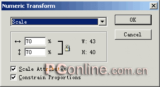 4、選中編輯區的對象,執行菜單命令“Edit--Clone(快捷鍵為Ctrl+Shift+D)”,原地克隆一個相同的傾斜橢圓對象。選中克隆對象,執行菜單命令“Modify -- Transform -- Numeric Transform(數值變形)”,在彈出的對話框中進行設定:將變形方式社為 Scale(縮放);水平、垂直縮放比例均設為70大小,下面的兩個復選框保持默認的勾選狀態,具體設定如下圖所示: