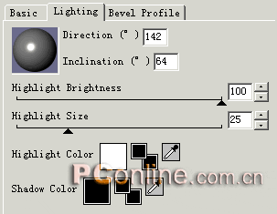 7、選中打孔後生成的橢圓環對象,執行PropertIEs屬性面板的Effects ---> Eye Candy 4000 LE ---> Bevel Boss 效果命令,在彈出的設置框中進行設定:Basic選項不用進行修改了,Bevel Profile選項也保持默認,Lighting選項需要進行一些簡單的調整,具體的數值大小根據橢圓環的大小來設定,本步的目的就是要產生園環的高光點效果,可以通過觀察預覽窗口的效果來進行調整,本例設定數值如下圖所示: