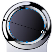 略作休息後,我們接著來畫手機的顯示器屏。用“橢圓形”工具畫一個直徑124像素的圓,然後用“細部”工具將該圓下面的節點,用方向鍵向上移動6個像素。以“線性”填充,色彩過渡由# 000000至# 726F8C,用全黑色進行“1像素柔化”描邊,羽化為1,效果如圖。