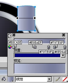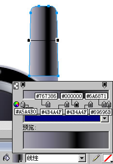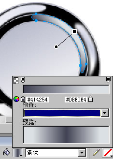 用“鋼筆”工具畫出金屬外圍下面的反光輪廓,改用“線性”填充,過渡過色由#FFFFFF至#414254,羽化為1,效果如圖。