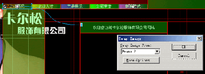 1、 單擊“企業概況”按鈕處的切片,此切片中心將出現一個圓形標志,用鼠標將其拖動到上一步創建的切片左上角,這將設置一個翻轉效果,在彈出的對話框中設定鼠標滑過時交換為第二幀的內容,如下圖所示: