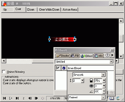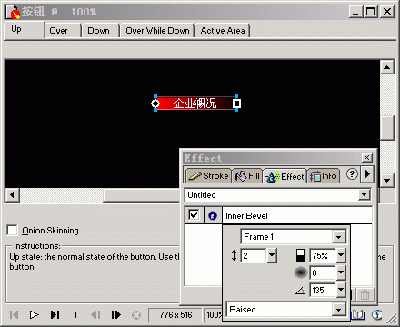 4、 常見按鈕的Up狀態,在按鈕編輯器的Up窗口我們可以向編輯普通對象一樣,為按鈕增加一些特效。打開Effect面板,為此按鈕矩形增加Inner Bevel特效,類型為Frame,如圖所示: