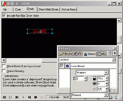 6、 切換到Down狀態,點擊下方的“Copy Over Graphic”將Over狀態的對象復制到Down狀態窗口。改變矩形的填充類型為實色填充Solid,改變按鈕的特效類型為Frame1,最後將文字的色彩改變為紅色,如下圖: