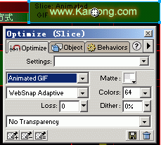6、 打開優化面板Optimize設定此切片的類型為“Animated GIF”,顏色數為32,如下圖所示: