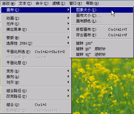 2.打開“修改”菜單,單擊“畫布”裡的“圖象大小”。