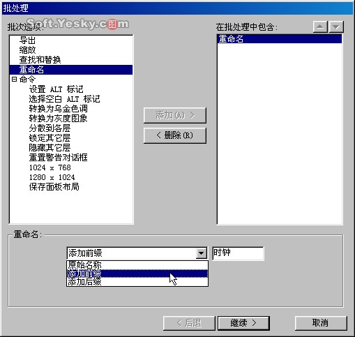 ,還可以設置執行動作時的先後順序。對於不需要的動作指令也可以從列表中選中後點擊“刪除”按鈕。在這裡我們試著把剛才導入的兩張圖片的原有名稱面前加上“時鐘”兩字,然後點擊“繼續”按鈕,進入下一個設置步驟。