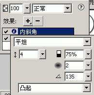 內斜角參數:斜角邊緣形狀為“平面”、寬度為4、對比度為75%、角度為135、按鈕預設為“凸起”。