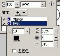 投影效果參數:距離為15、透明度為65%、柔化為6、角度為315。
