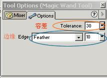 可有時在用魔術棒工具做選區的時候,往往不盡如人意,看上去明明色彩有很大區別的地方也被選中了,呵呵,不急,魔術棒裡有個屬性叫“容差”。“容差”表示用魔術棒單擊一個象素時所選的顏色的色調范圍。如果輸入0 並單擊一個象素,則僅選擇色調完全相同的相鄰象素。如果輸入65,則選擇一個更大的色調范圍。這下明白了吧,如果有不明白的多試下就知道了,也可以適當的用Edge屬性修飾一下。1