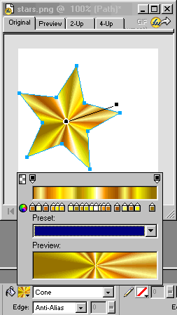 第一個五角星:第一個五角星采用圓錐形(Cone)填色,從屬性欄中的填色面版可以看到使用了多種顏色來體現金屬多種光線的折射效果。