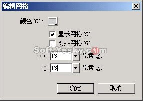繪制步驟: 1) 新建一個大小為325×195的文件,點擊“視圖”菜單,選擇“網格-顯示網格”用以打開網格方便的編輯。接著選擇“網格-編輯網格”,這時跳出“編輯網格”對話框,在其中設置網格顏色為#CDCD,設置網格的寬高均為13,如圖1所示,得到圖2所示的圖像。