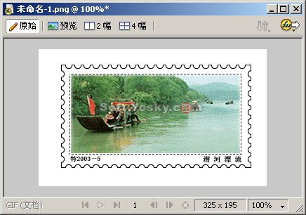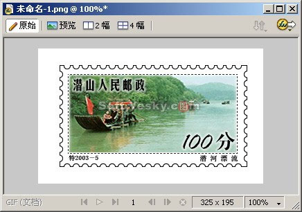 9) 使用工具箱上的文本工具在“郵票”底部為其添加郵票志號——“特2003-5”和郵票名稱“潛河漂流”,字體設為宋體,大小為10,並將其加粗,得到圖11所示的圖像。
