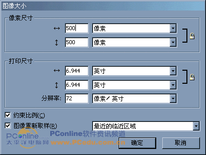 4、在編輯區以外的任意地方單擊鼠標左鍵,屬性面板成為“文檔"屬性面板的顯示狀態。單擊面板上“圖像大小"按鈕,在彈出的“圖像大小"設置框中,將圖像的“像素尺寸"區域的寬和高的數值大小都設為 500,然後單擊“插值法"的下拉菜單,將插值方式設為“最近的臨近區域",具體設置如下圖所示。