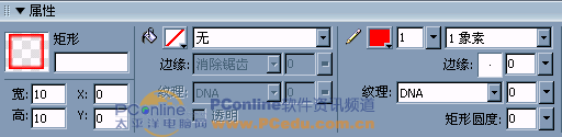 7、使用矩形工具在編輯區繪制一個矩形對象,在屬性面板上設置矩形對象的填充色為“無",描邊色采用“紅色",描邊類型為“1像素",寬,高均為10像素大小,具體設置如下圖所示: