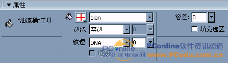 10 、單擊工具箱上的“油漆桶"工具,然後調整屬性面板的填充設置。單擊“填充類別"的下拉菜單,選擇“圖案——",在彈出的“定位文件"的對話框中選擇我們第8步操作保存的文件即可,顏色填充井就會顯示出我們剛剛制作保存的紋理圖案了,屬性面板此刻如下圖所示,