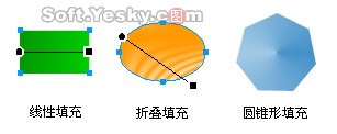 當按住Shift鍵不放的時候可以畫出正方形和圓形,在各形狀工具的屬性框中都可以方便的為這些圖形選擇不同的填充模式加以填充。通過顏色的調節手柄可以自由的控制色的填充方向及范圍。