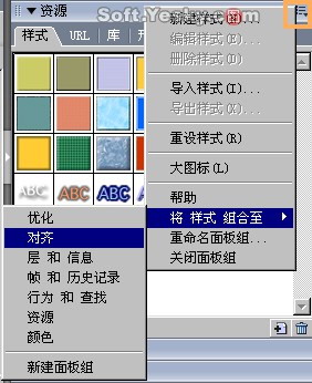 組合面板:Fireworks的組合面板共有14個,分別為“信息、層、混色器、顏色樣本、樣式、URL、庫、形狀、幀、歷史記錄、行為、查找、優化和對齊面板”。每個面板即可相互獨立進行排列又可與其它面板組合成一個新面板。但各面板的功能依然相互獨立。點擊面板上的名稱可展開或折疊該面板。例如圖1—04中,則是把“樣式”面板與“對齊”面板進行組合,形成一個新的組合面板,如圖1—05所示。
