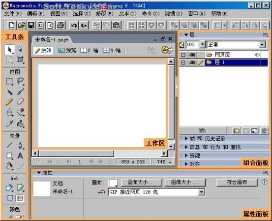 新建文檔完成後就可以看到Fireworks的工作界面了,如圖。 Fireworks的工作界面由“菜單欄”、“工具欄”、“工作區”、“工具條”、“組合面板”和“屬性框”六個部分組成。