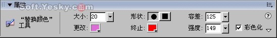 在“替換顏色”的屬性框中還可以對“替換顏色”筆觸的大小、形狀、容差和強度進行設置。而“彩色化”是指用“終止”顏色去替換“更改”顏色。取消選擇“彩色化”以便用“終止”顏色對“更改”顏色進行塗染,並保持一部分“更改”顏色不變。