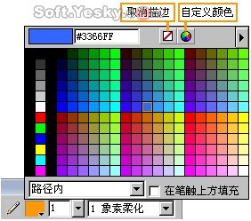 顏色樣版——在描邊顏色預覽窗中可以選擇一種色彩作為路徑的描邊色。預選的色彩及該色彩的網頁色數值都會在樣版的左上角中顯示出來。同時也可以直接輸入想要的網頁色數值,然後按“回車”即可;