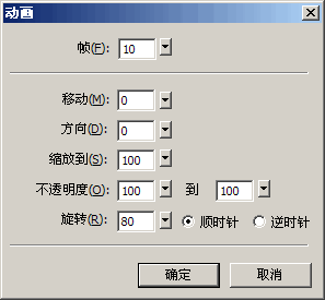 13、在幀面板中新建空幀,粘貼對象至畫布內。對當前公告牌進行由右至左的鐘擺動畫設置。選擇修改菜單、動畫、選擇動畫命令,彈出動畫屬性設置窗口。進行參數的設置,其中各參數與第九步相同,僅需要給旋轉方向上變化為順時針。如圖。