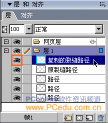 為了畫出這些小裂縫的凹陷效果,我們需要有這樣的兩條路徑配合才行。將這路徑再復制一份,打開“層”面板後可以看到,剛復制出來的新路徑會位於原路徑的上一層。為了便於辨認,可以雙擊對象層中的名稱,對這兩個路徑進行重命名,如圖05所示。因為復制的這條路徑要在稍候才需使用,因此可點擊該對象層左邊的“眼晴”圖示,使該路徑暫時處於不可編輯的隱藏狀態。