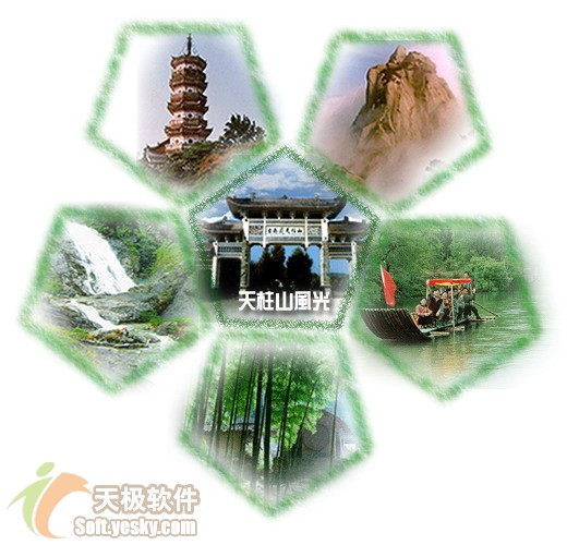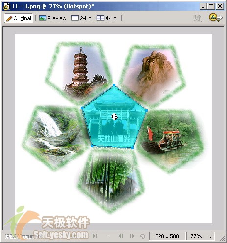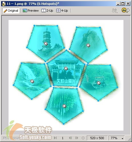 如果選擇多個對象,如圖6所示,我們選擇天柱山風光圖的六幅小圖的邊界路徑,接著選擇“Edit”菜單下的“Insert”->“Hotspot”,這時候會跳出圖7所示的對話框,我們選擇“多重”按鈕,這樣就為所有的小圖像添加上了熱區了,如圖8所示。
