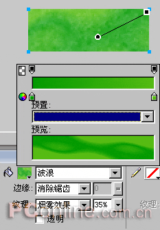 准備工夫做好後我們就來正式繪制了。在畫布上用“矩形”工具畫一個88*31大小的長方形,使其覆蓋整個畫布。然後用“波浪”漸變進行填充,漸變色由# 009900至# 56BB12。再用35%的“煙霧效果”進行紋理填充,如圖03。