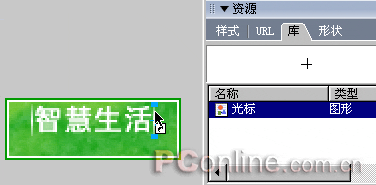 此時啟動“庫”面板的話,可以看到裡面就有我們剛轉換完成的“光標”元件。選中它,並將其直接拖拽至畫布當中。然後通過方向鍵的移動,把它放置在“活”字的右邊並與“智”字前的光標元件進行水平對齊,如圖09。
