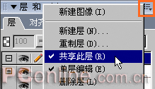 我們注意到,在這個表情中只有汗滴是需要做成運動的,而其它對象則仍保持著靜止狀態。因此我們可以考慮將該汗滴轉成動畫元件的方式來完成這一動畫過程。我們點擊“層”面板中右上角的下拉菜單,從中選擇“共享此層”,如圖24。