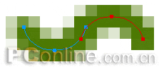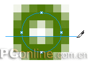 我們再來繪制它的嘴吧。先畫一個5*5大小的圓,取消其填充色,選用2像素的柔化描邊,描邊色為# 4B7801。然後用“路徑切割”工具將該圓一分為二,如圖27。