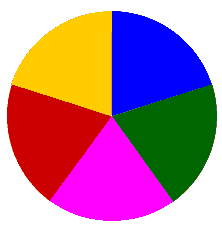 如左圖所示:這個圓等分為五份,每部分的顏色都不一樣。其實在Fireworks裡制作很簡單,不信您可以看看:)