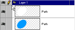 第二、選中變形後的橢圓,"edit-->clone" ,克隆一個新的橢圓,將其填充色改為白色(這個顏色就是將來你要產生對比效果的顏色,可以隨自己的需要來變動),克隆後的白色橢圓的位置和藍色橢圓位置重合。層面板如左圖所示。