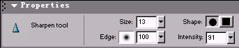2、Sharpen tool(銳化工具)。從字面上我們就可以清楚的意識到這個工具的功能應該恰恰與模糊工具相反,而是用來強調某一塊區域,並使像素突出尖銳顯現出來。選定該工具後,相應的PropertIEs屬性面板會如下圖所示: