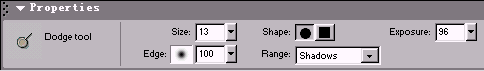 3、Dodge tool(加亮工具)。該工具是用來加強像素顏色的亮度的,就象使用一塊海綿在顏色塊兒中吸掉一些水分,使顏色變淺、變亮。選定該工具後,相應的PropertIEs屬性面板會如下圖所示: