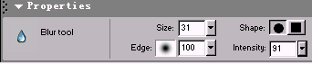 1、Blur tool(模糊工具)。是用來模糊圖像的,通常我們想模糊圖像時總是第一感覺想到使用濾鏡,但是我們知道濾鏡的操作對象必須是整個位圖區域或者部分選擇區域,如此一來,就有很大的局限性了,使用Blur tool便可以實現對操作對象的局部模糊,並且形狀可以自由支配,你需要做的就是在需要模糊的區域晃動你的鼠標即可了。在實際操作中,選定該工具後,相應的PropertIEs屬性面板會如下圖所示: