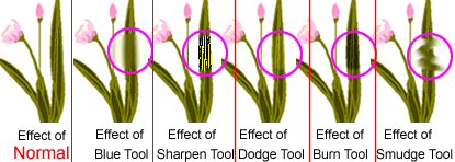 在工具箱中,我們可以看到FWMX的Bitmap工具組中新增了兩組工具:1、Brush Tool(筆刷)工具;2、塗抹工具組,點擊該工具位於右下角的彈出箭頭不要松開鼠標,就會顯示出其包括的五個小工具。a、Blur tool (模糊虛化工具)b、Sharpen tool(銳化、鈍化工具)c、Dodge tool(加亮工具)d、Burn tool(加暗工具)e、Smudge tool(塗抹工具)。