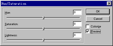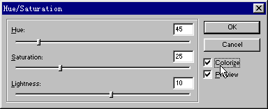 3.將屬性設置為如下數值,可適當微調.注意勾選Colorize選項.Colorize使RGB彩色圖象變成單一彩色的雙色調圖,或者轉化為灰階圖.選擇Colorize,色調和飽和度的范圍值會相應變化,分別為0至360,0至100.