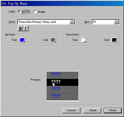 在此,讓我詳細地介紹一下以上窗口的內容。Cell欄:那是菜單選項的格式,html是html文本格式,而image是指圖片格式。選擇不同,會有不同的效果。在此,本人較贊成用圖片格式,因為那看起來較漂亮些。下面的是字體和字號的選擇,這隨你喜歡啦!up state是指鼠標放到按鈕時的字體設置和菜單格的設置,overstate是指鼠標放到菜單欄時字體的設置和菜單格的設置。你可以選擇一種你喜歡的格式。PrevIEw是預覽欄,因為該軟件對中文支持不好,所以顯示為不正確,你可以不管它,因為導出時是正常的。之後,按“finish”搞定。完成這些設置後,按“文件”菜單的export選項,導出Html文件,這樣你可以預覽啦!嘩,是不是很酷呢!如圖5