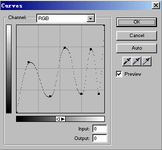 第七步、 關鍵的一步!選定該文字對象,繼續進行Effect效果設定。選用其中的Adjust Color--Curves效果命令。在隨後彈出的設定框中,進行相應的調整如圖06所示:(注意:調節的光源節點越多,出現的效果就會越奇妙,當然生成的文件也會相應更大些)