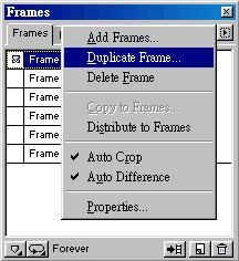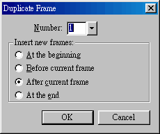 - 要創造動態時,就要使用Frame的toolbar。從拉下的選單中選擇Duplicate Frames,在對話框中的數字選擇1,按下OK。