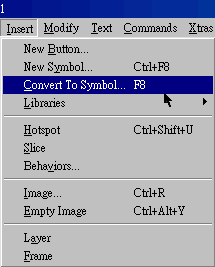 - 選擇要做為symbol(符號)的物件,選取菜單指令Insert>Convert to Symbols來把它定義為symbol(符號)。如果你不想要一個特定的instance(分身)被連結symbol時只要選取菜單指令Modify>Symbols>Break Link就可以解除與symbol(符號)的連結。