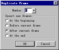 第六步:在隨後彈出的對話框中,Nmmber(插入桢的數目)選擇“1”,我們只需要插入一桢即可;Insert ner frames(插入新桢的位置)選項選擇默認的“After current frame(在當前桢的後面)”選項,然後點擊OK按鈕確定,這樣我們就在當前桢的後面(也就是第2桢)插入了一個復制的新桢,新桢的內容和第一桢的內容是完全一致的,如圖06所示: