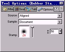 (橡皮圖章工具),打開Option(選項)面板進行設定:將橡皮圖章工具的邊緣設置為最柔和的邊緣,如下圖所示: