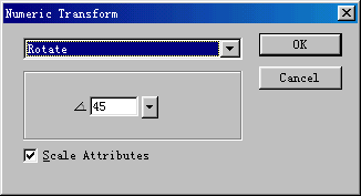 3、在正方形處於選中狀態下,執行菜單命令"Modify--Transform--Numeric Transform",在隨後彈出的對話框,選取變化的方式為"Rotate(旋轉)",並且輸入旋轉的角度為45度,具體設置如下圖所示: