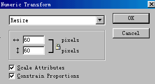 3、選中該正方形,Edit>Clone,克隆出一個,選中克隆出的正方形,Modify>Transform>Numeric Transform,在彈出的對話框中把長和寬都設為60象素。然後同時選中這兩個一大一小的正方形,Modify>Combine>Punch。這樣,我們得到了一個邊框為20象素的镂空正方形