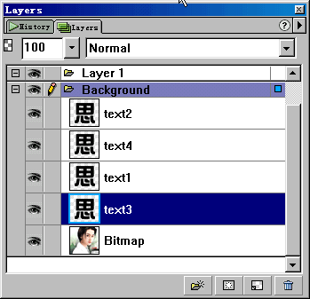 4、大家是不是克隆幾次後有些發暈了?:)。選中text3,把它拖放到text1層之下。此時,text2和text3層是移動了象素的文字層,大家要清楚。此時各層的關糸如圖。